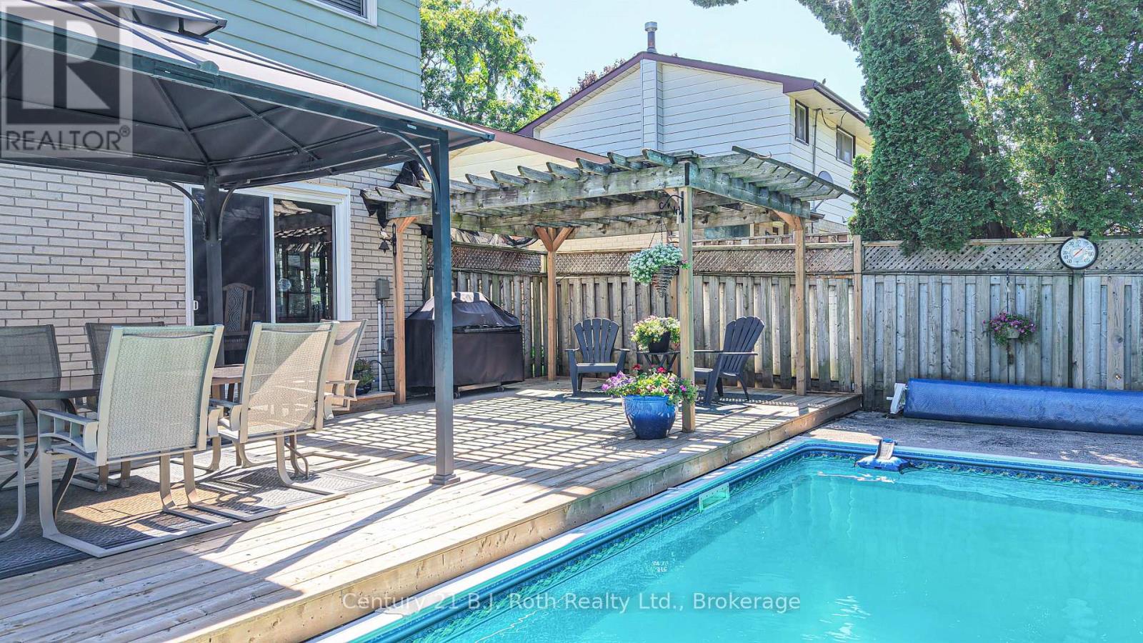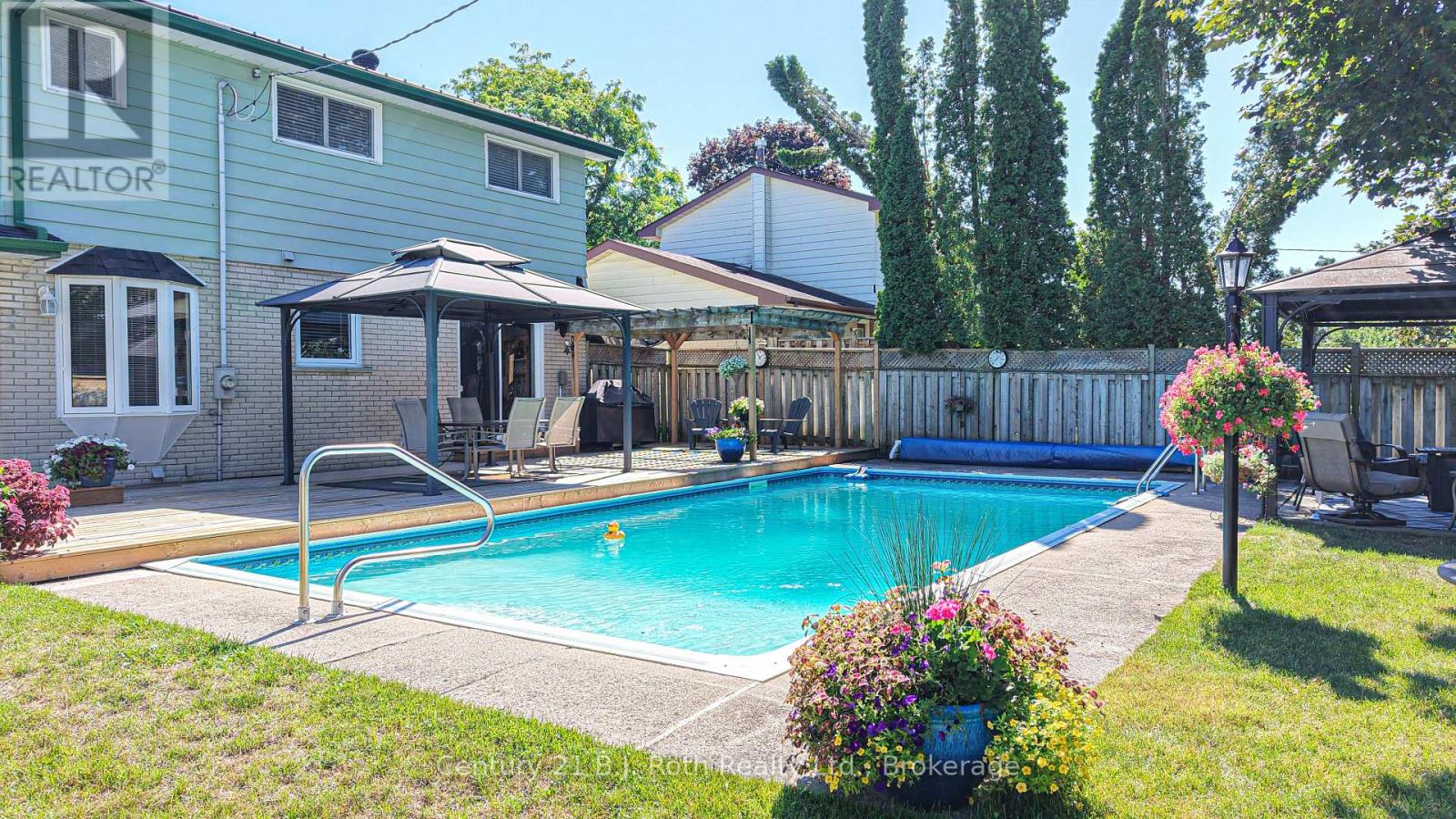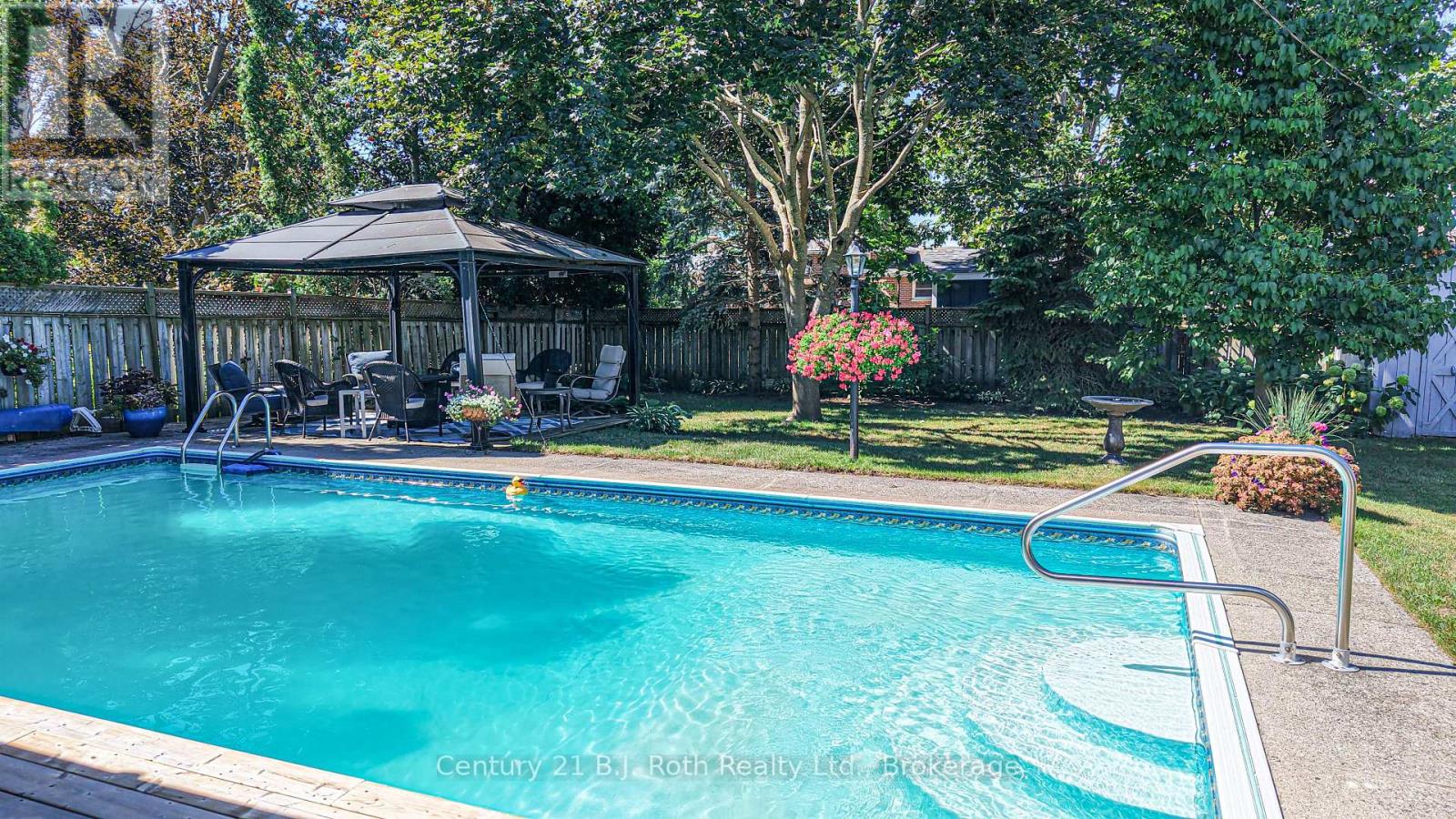 Now is your chance to raise your family in one of the most sought-after North Ward neighbourhoods! This well-maintained 4-bedroom, 1.5-bath, 2-storey home offers comfort, convenience, and fantastic outdoor living-perfect for today's busy family.A welcoming covered entry leads into the bright main floor featuring gleaming hardwood floors throughout. The spacious living room with bay window fills the space with natural light, while the adjacent dining area overlooks the picturesque back yard. The efficient galley-style kitchen boasts classic oak cabinetry, a cozy breakfast nook, and direct access to your fully fenced backyard oasis. A convenient 2-piece powder room is located on the main level. The original garage has been converted into a versatile space currently used as a main-floor laundry, but it would easily function as a playroom, home office, recreation room-or be converted back to a garage if desired. Upstairs, you'll find a beautifully updated 4-piece bathroom and four bedrooms, including one with a charming built-in desk/craft area and a spacious walk-in closet. The mostly finished basement offers a cozy family retreat complete with a gas fireplace and a bar area, ideal for relaxing or entertaining. Step outside to your private, treed, fully fenced backyard, featuring an expansive updated deck overlooking the inground pool, complete with a newer gas heater. Relax in the sunshine under the Pergola or choose to sit under one of the 2 Gazebos. It's the perfect setting for summer gatherings and family fun. Additional updates include windows & shingles. The home is equipped with natural gas heating and central air conditioning for year-round comfort. Located close to parks, schools, shopping, and just a short walk to downtown, this property offers the ideal blend of lifestyle and location. (id:4069)